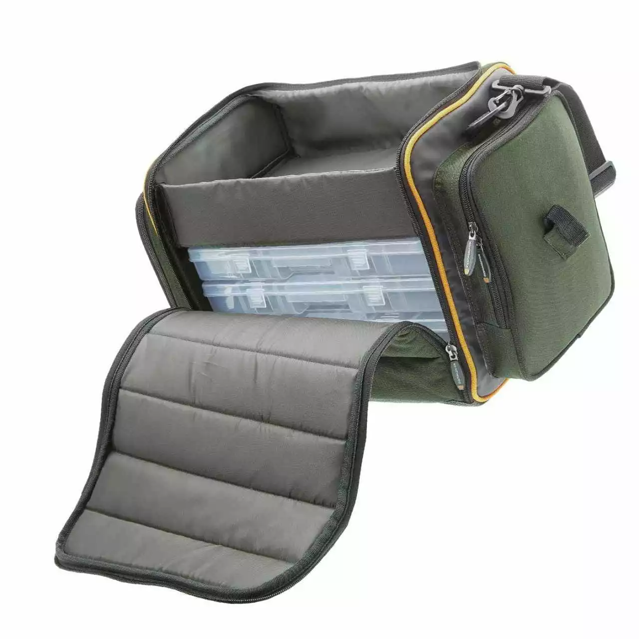 Gut gepolsterte Spinnfischer Einsatztasche im klassischen „Frontloader“ Stil mit 2 getrennten Hauptfächern, die über einen gemeinsamen Taschendeckel zugänglich sind!