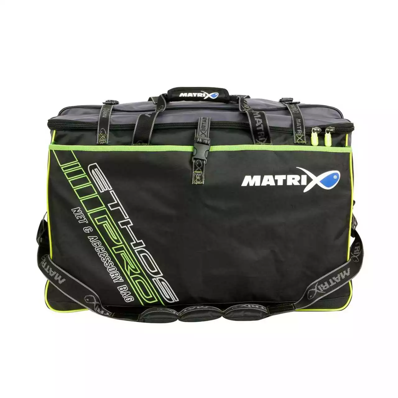 Die Ethos Pro Net & Accessory Bag ist die ideale Lösung, wenn du dein Setzkescher und weitere Angeltackles mit an den Angelspot nehmen willst. Zwei große Hauptfächer sind für den Transport von Sitzkiepenzubehör, Angelgerät und Futter geeignet. Ein Außenfach mit Reißverschluss eignet sich zur Aufnahme von Kescher, Zubehör, Siebe und Seitenauflagen. Ein zusätzliches Setzkescherfach besitzt sogar Wasserablauflöchern und ausklappbare Fächer außen für Kleinteile und Köder runden die Aufnahmekapazität dieser Tasche ab.